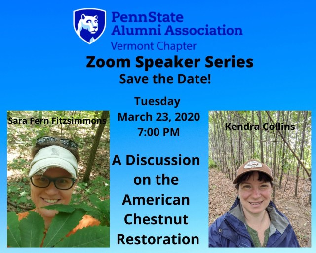 | Generally recognized to be the greatest ecological disaster of the 20th Century, the American Chestnut Tree Blight which decimated the Appalachian region’s greatest source of food for wildlife and for livestock set loose to feed in the wild, isn’t what comes to mind for most people. As devastating as it was, it didn’t wipe the tree out entirely. Through the careful and diligent work of dedicated scientists at The American Chestnut Foundation, Penn State, the University of Vermont and the State University of NY among others, the tree may soon thrive again for future generations. On March 23rd at 7pm, join the Vermont Chapter in hosting American Chestnut Foundation coordinators Sara Fern Fitzsimmons (PSU) and Kendra Collins (UVM) when they team up to present a historical overview of why the blight was so devastating, restoration efforts so important, and now so promising and possible. Sara Fern Fitzsimmons has worked with The American Chestnut Foundation (TACF) at Penn State University since 2003, assisting chestnut growers and researchers throughout the Appalachian Mountains. Born and raised in southern West Virginia (Hinton), Sara studied Biology at Drew University in Madison, NJ. She then received a Master’s degree in forest ecology and resource management from Duke University’s Nicholas School. Sara hopes her research and professional work will facilitate long-term conservation and restoration of native tree species at risk from exotic pests and diseases. Kendra Collins, New England Regional Science Coordinator Kendra joined The American Foundation (TACF) in 2008 as Regional Science Coordinator for the New England region, which includes the ME, VT/NH, MA/RI, and CT state chapters of TACF. She received a BS degree in Environmental Conservation Science from the University of New Hampshire and an MS in Natural Resources: Forestry from the University of Vermont. Her Masters research focused on American chestnut restoration, which led her to become involved with TACF and the formation of the VT/NH chapter. Kendra worked previously with citizen scientists through New Hampshire’s Volunteer Lake Assessment Program. Topic: Vermont Chapter Speaker Series – American Chestnut Restoration Time: Mar 23, 2021 07:00 PM Eastern Time (US and Canada) Join from PC, Mac, Linux, iOS or Android: https://psu.zoom.us/j/93740967154?pwd=MDZGOHh3VXRuUGtRdmxXbU9QZmFDZz09 Password: 022045 Or iPhone one-tap (US Toll): +16468769923,93740967154# or +13017158592,93740967154# Or Telephone: Dial: +1 646 876 9923 (US Toll) +1 301 715 8592 (US Toll) +1 312 626 6799 (US Toll) +1 669 900 6833 (US Toll) +1 253 215 8782 (US Toll) +1 346 248 7799 (US Toll) Meeting ID: 937 4096 7154 Password: 022045 |