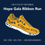 The Hope Gala’s annual virtual run fundraiser, the Ribbon Run, is back for a third year! Between November 23rd and November 29th (Giving Tuesday), show your support for The Hope Gala by running, walking, rolling, scooting, swimming, or sliding 5…